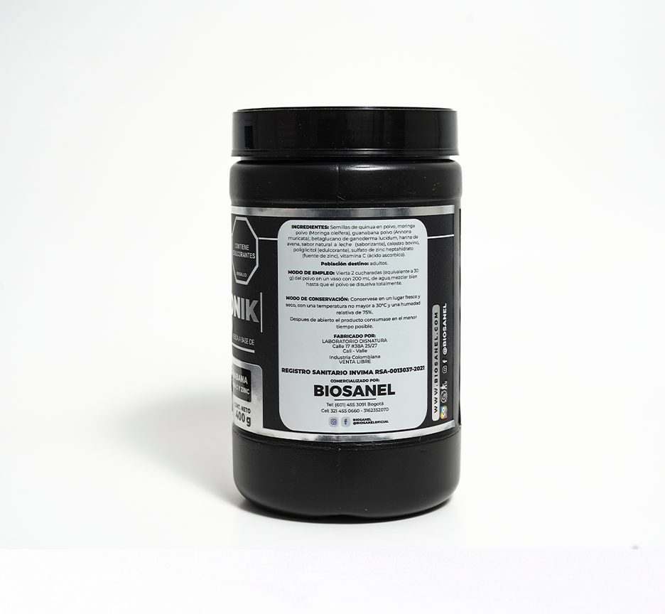 Caltronik es un suplemento alimenticio formulado con calostro bovino como ingrediente principal, complementado con quinua, vitamina C y guanábana. Esta combinación ha sido seleccionada por su valor nutricional y por su uso tradicional en el fortalecimiento del organismo.