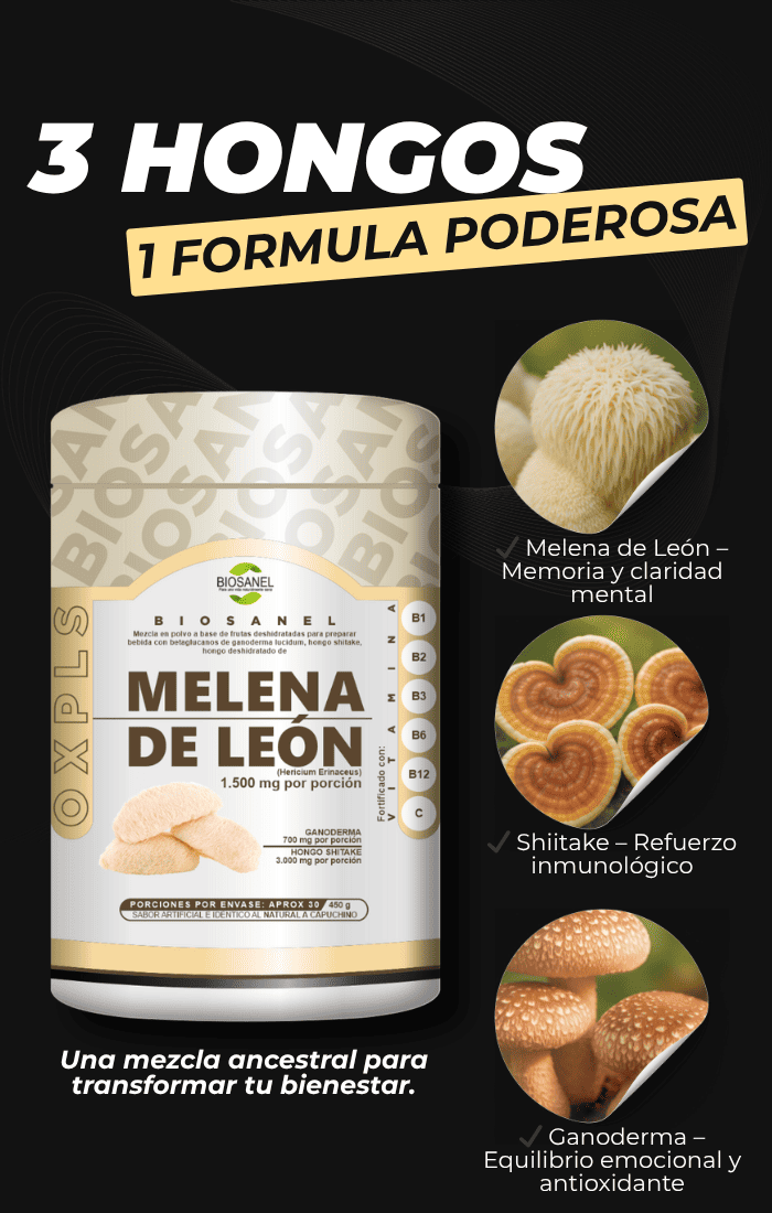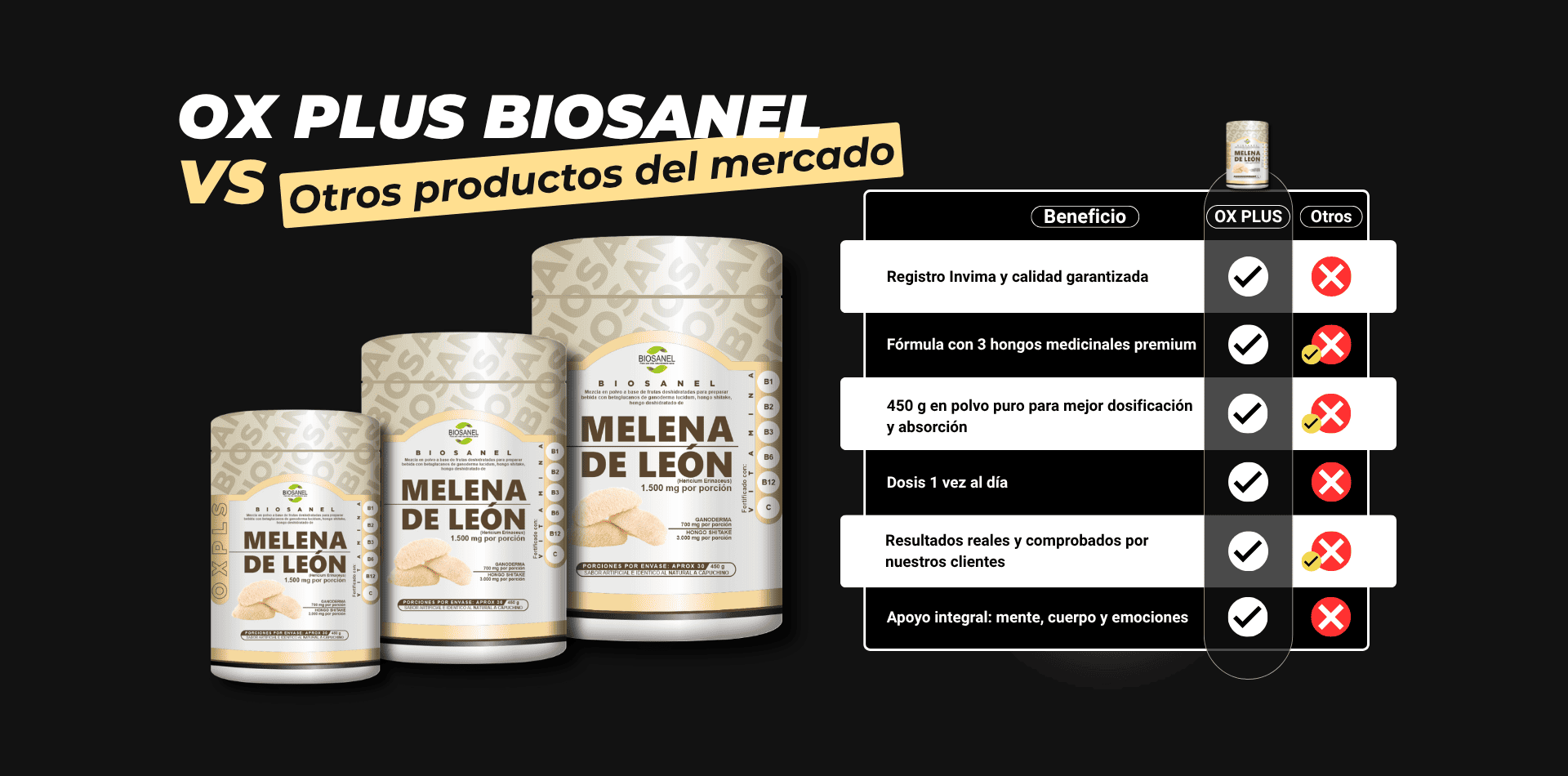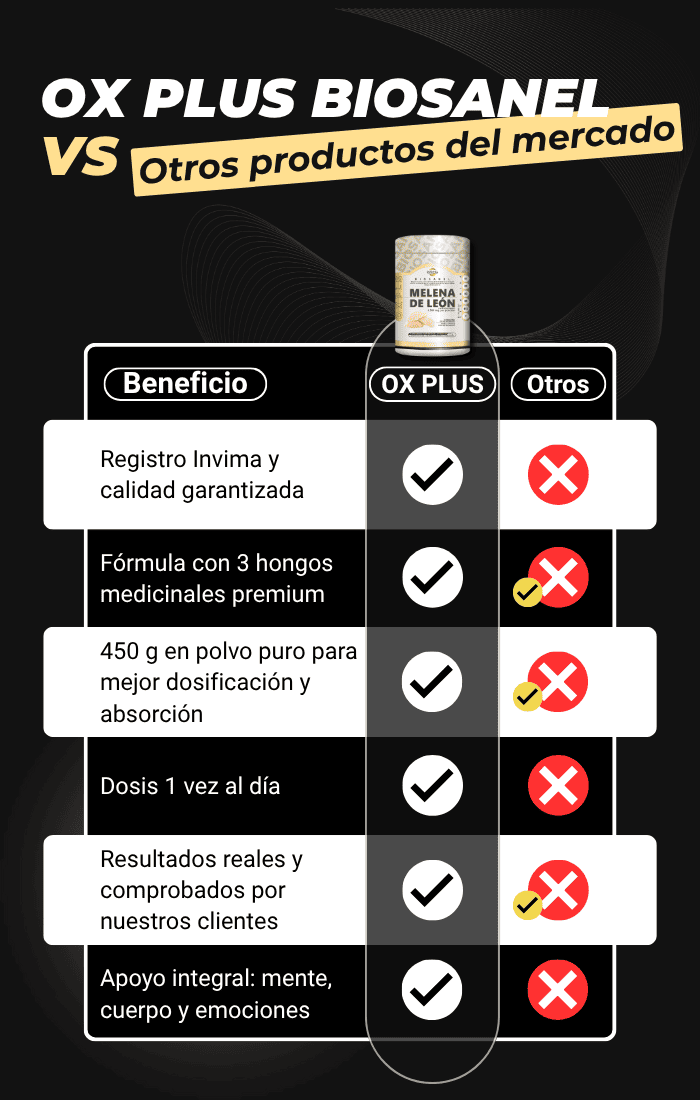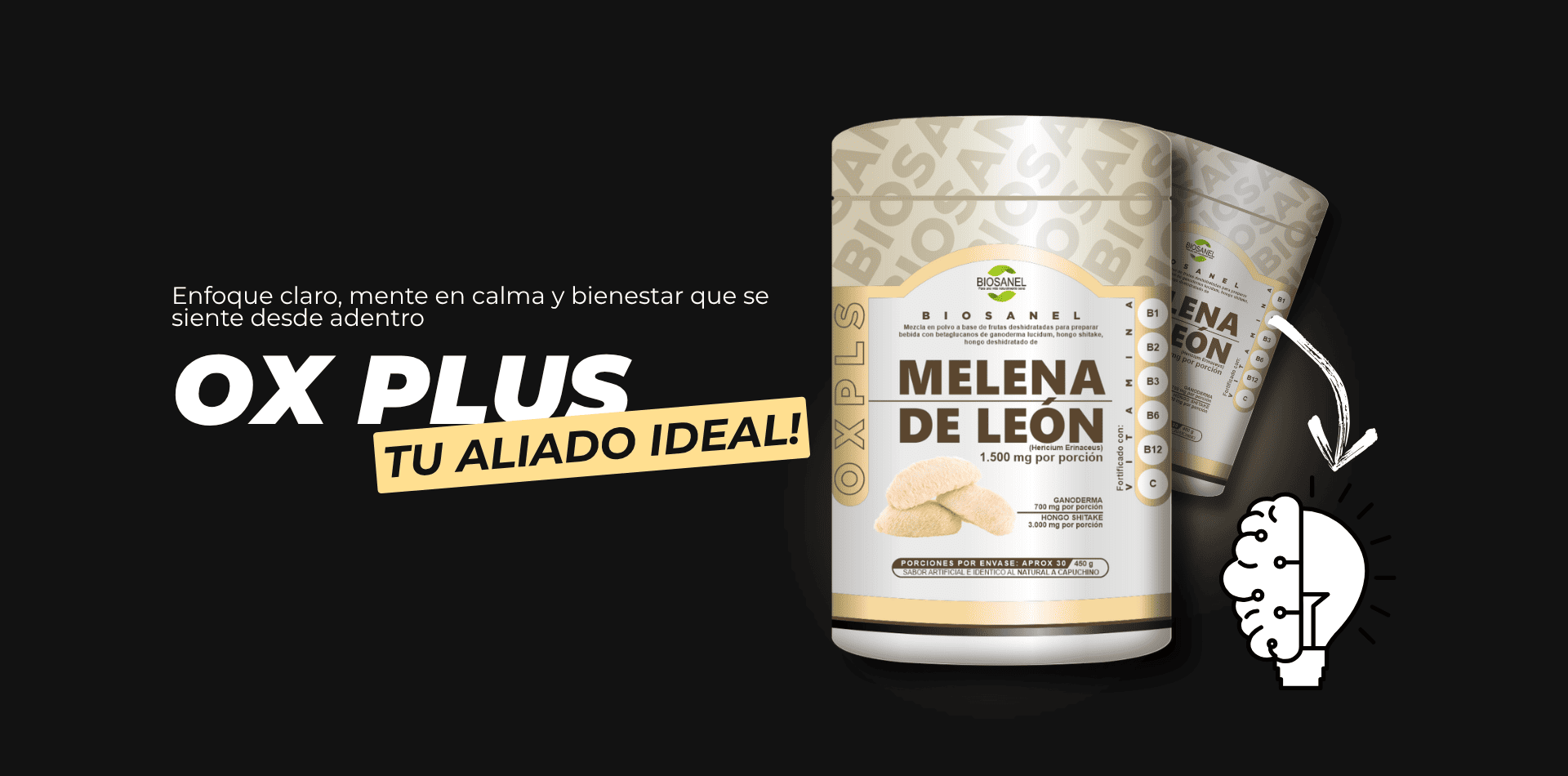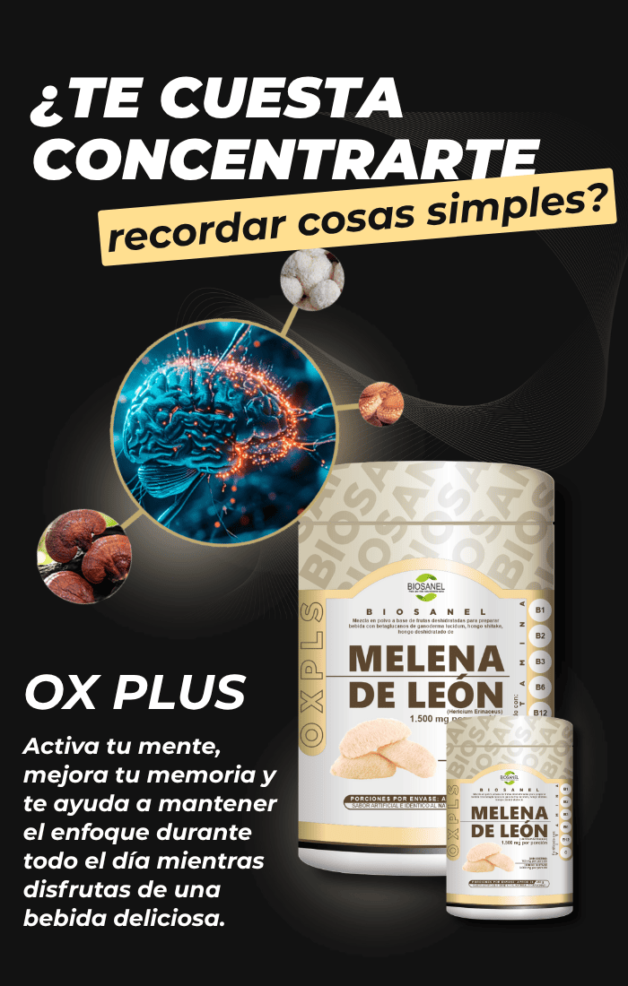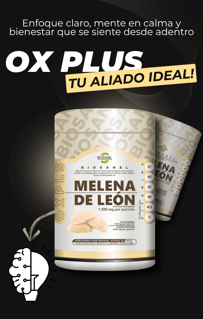 OX Plus es un suplemento natural a base de hongo Melena de León, Shiitake y Ganoderma, formulado para mejorar la oxigenación celular, fortalecer el sistema inmunológico y potenciar la energía. Gracias a sus poderosos antioxidantes, contribuye al bienestar general, la claridad mental y la vitalidad diaria.