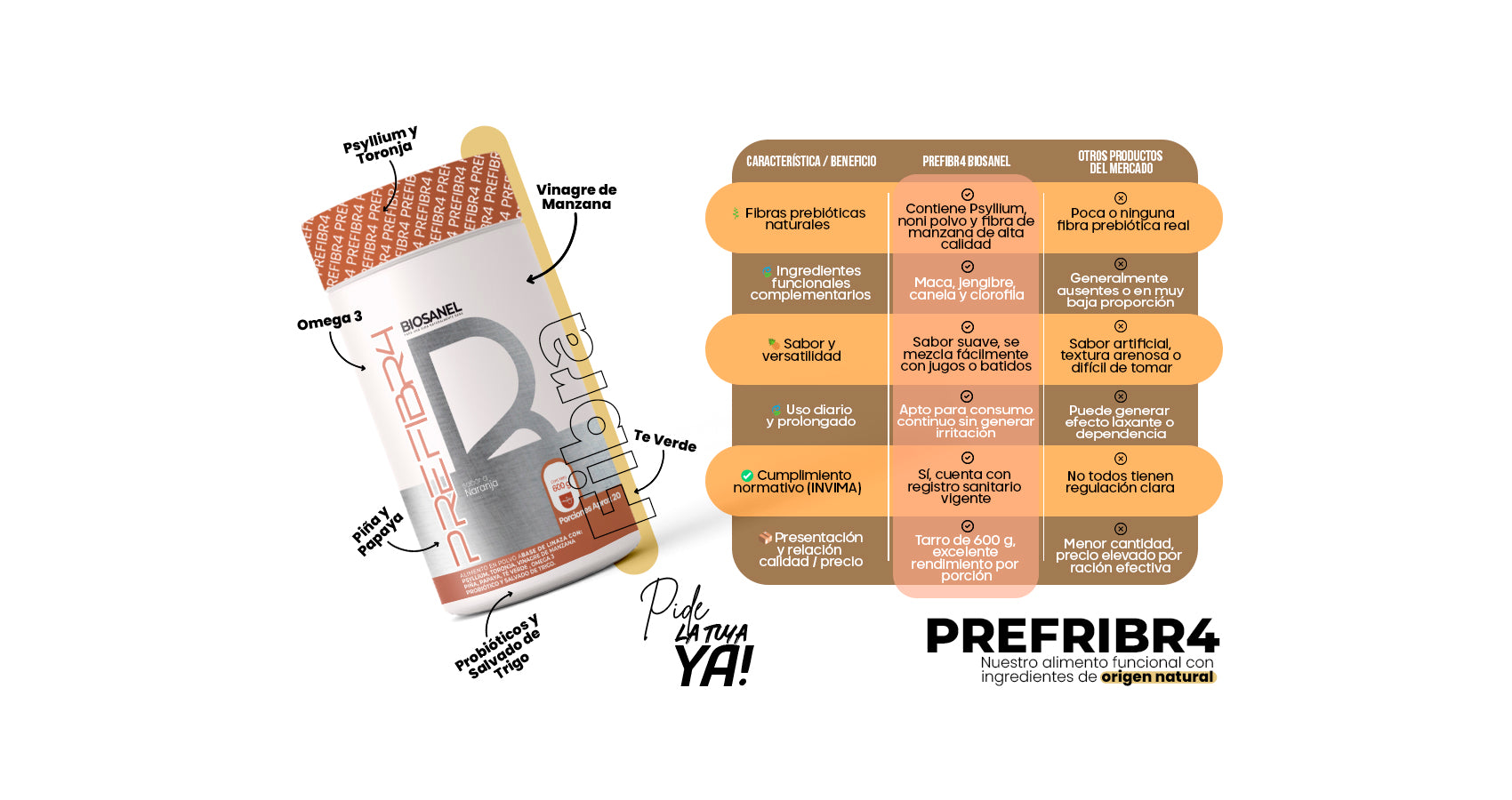 A diferencia de otros suplementos, PREFIBR4 tiene un sabor agradable y una textura fácil de disolver, lo que permite incluirlo en jugos, batidos, yogures o agua sin alterar el sabor de tus preparaciones.